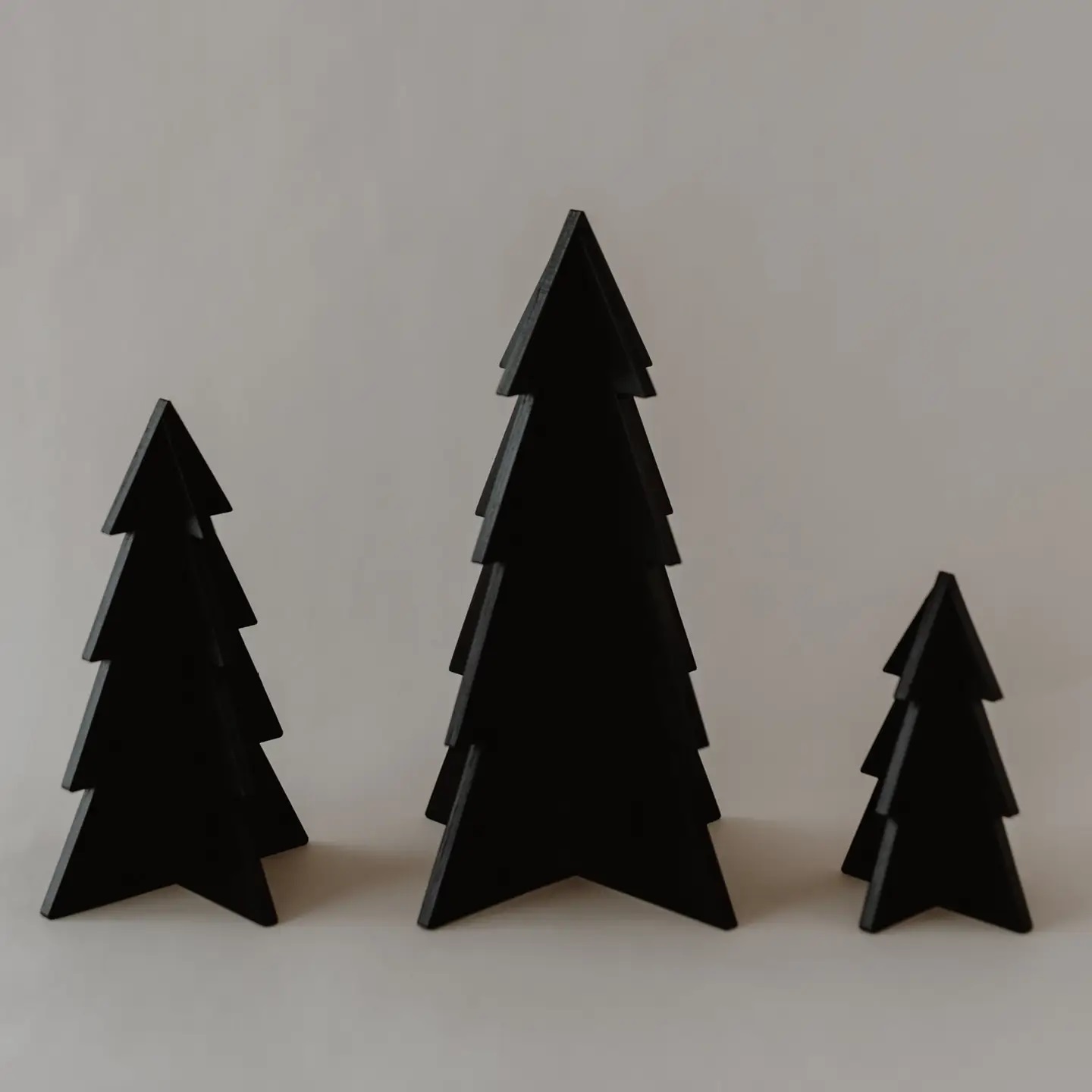 Die Tannenbäume im 3er Set in Schwarz aus Holz sind die perfekte winterliche Dekoration für die Fensterbank oder den Esstisch. Das Set besteht aus drei unterschiedlich großen Tannenbäumen, die einfach zusammengesteckt werden können. Ob schlicht oder mit einer Lichterkette dekoriert, diese Tannenbäume zaubern eine festliche Atmosphäre in jedes Zuhause.