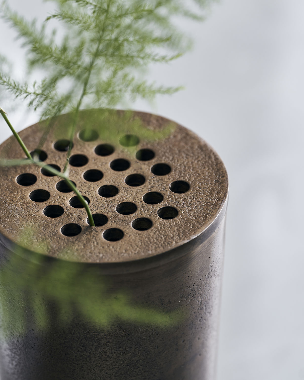 einem dezenten Messing-Ton sorgt für Glanz, während die Löcher die Vase